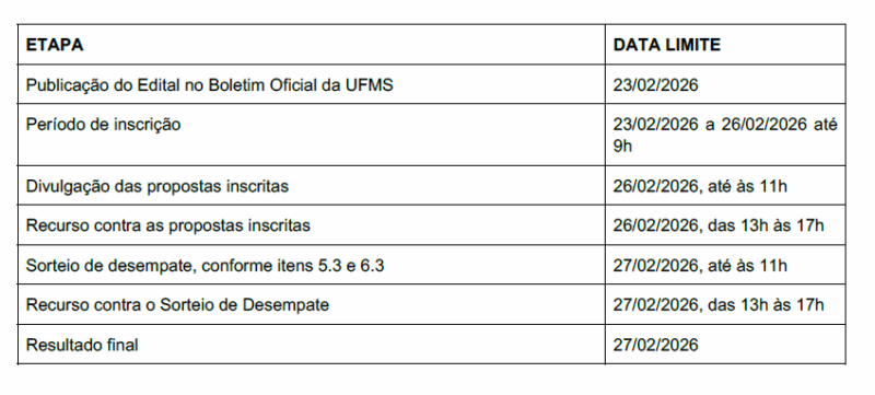 A Universidade Federal de Mato Grosso do Sul (UFMS), por meio do Câmpus do Pantanal (CPAN), publicou o Edital CPAN/UFMS nº 2/2026, que estabelece as normas para seleção de barracas que irão compor o Show de Verão da Recepção dos Calouros 2026.